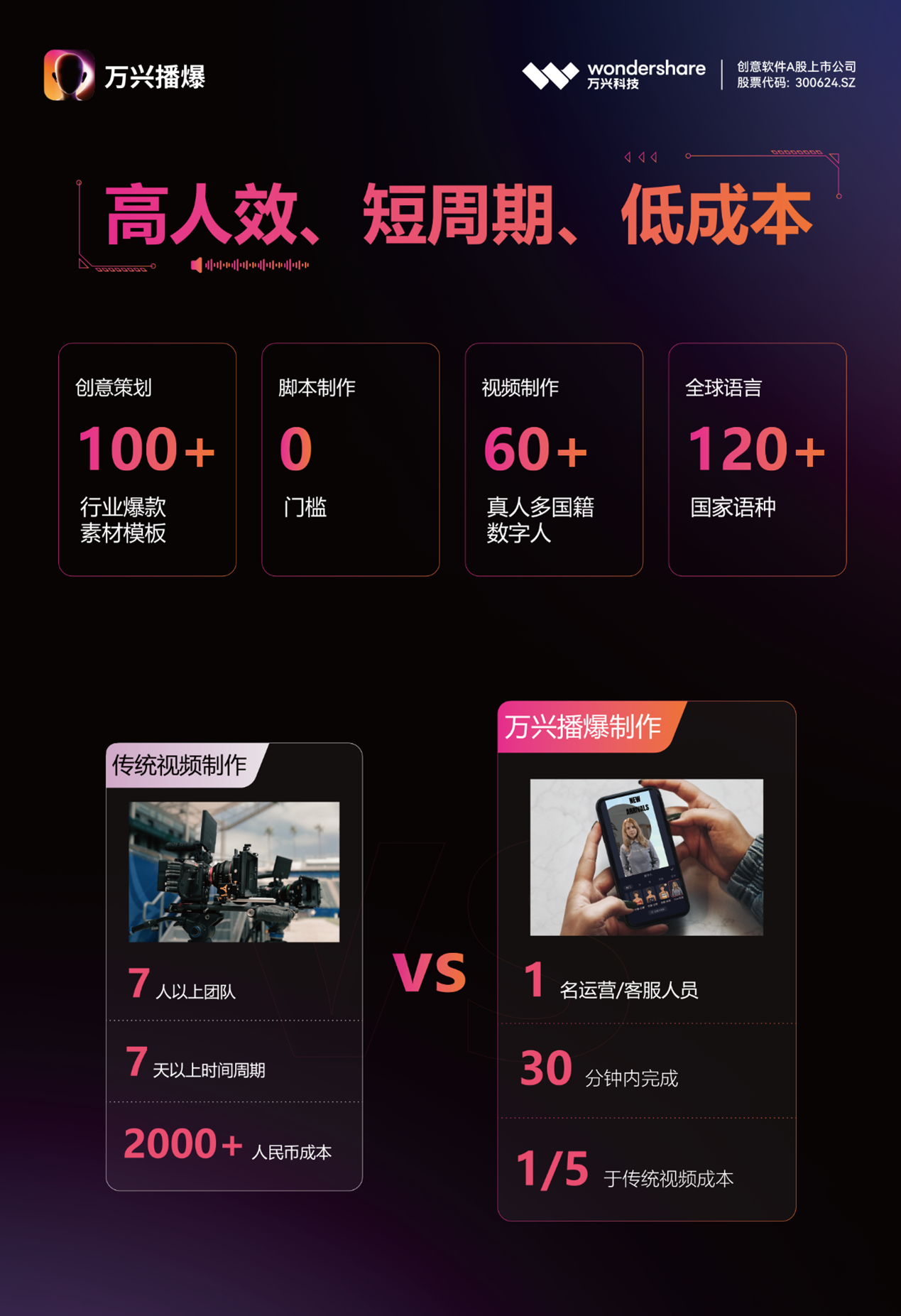 如果说,传统的出海营销视频制作,通常需聘请外国模特演员或购买专业设备,需真人出镜进行拍摄和录制,可能还需找第三方合作、耗时数天甚至数周才能完成全流程创作,借助万兴播爆,一个人就是一支队伍,几分钟即可轻松创作爆款国际化短视频,与此同时预计还可节省约80%以上的预算,制作完成的视频支持商用,可以导出至任意平台。